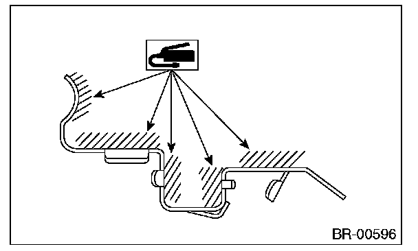 1) Apply a thin coat of Molykote M7439 (Part No. K0770YA000) or grease contained in the pad kit to the pad clip.