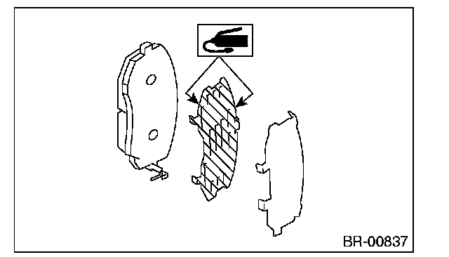 2) Apply a thin coat of Molykote AS880N (Part No. K0777YA010) or grease contained in the pad kit to both surfaces of the pad inner shim.