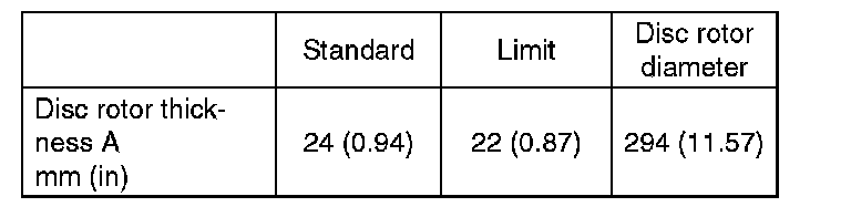 4) Set a micrometer 10 mm (0.39 in) inward from the disc rotor outer perimeter, and then measure the disc rotor thickness. If the disc rotor thickness (A) exceeds the service limit, replace with a new disc rotor.