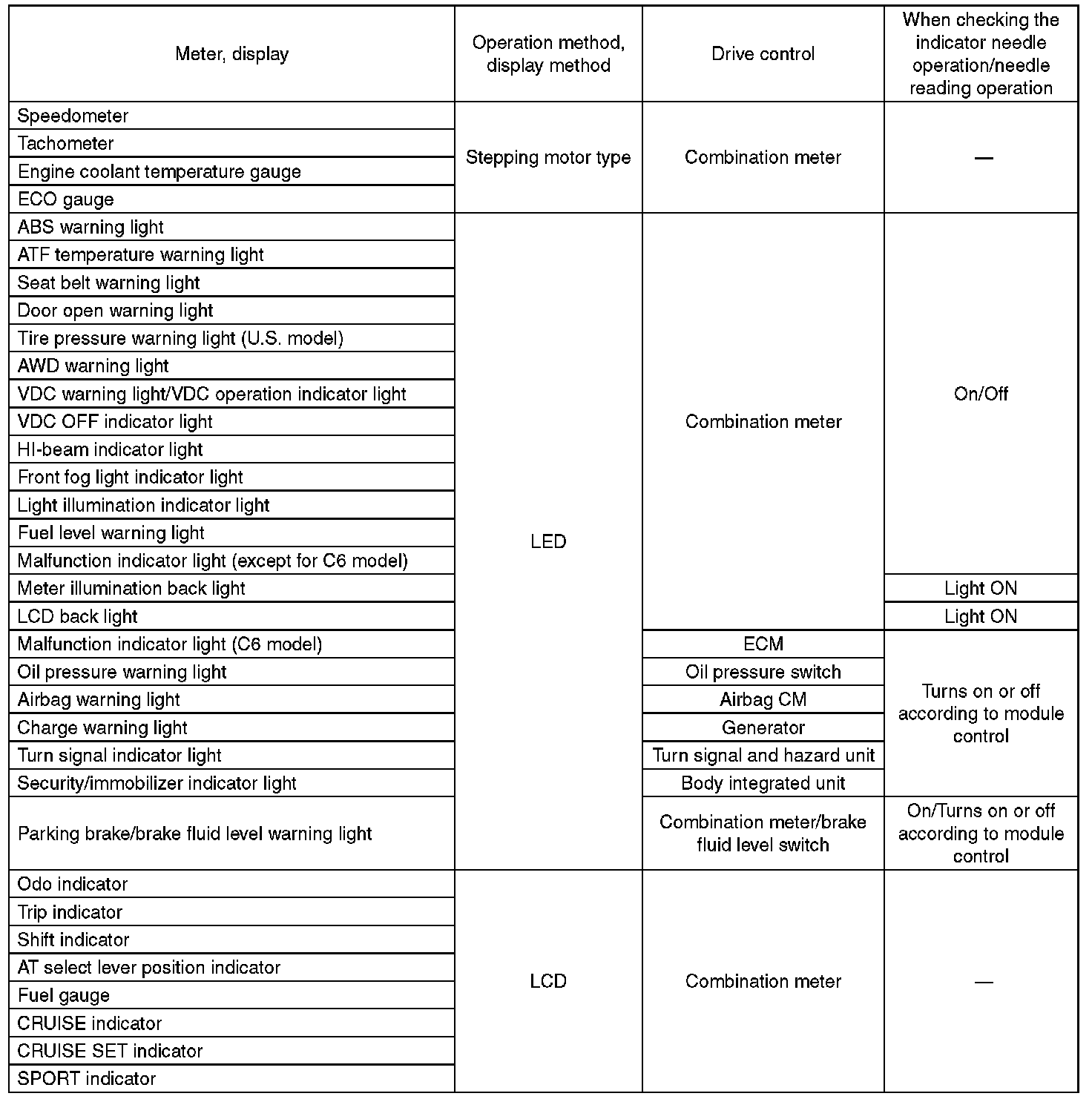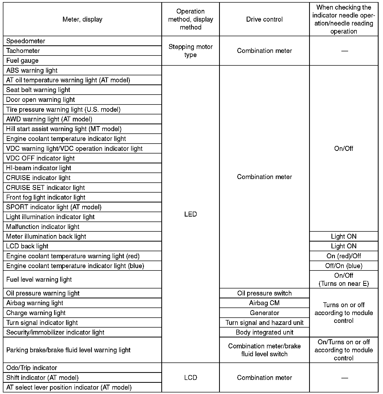 Instrument Panel, Gauges and Warning Indicators: Specifications