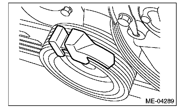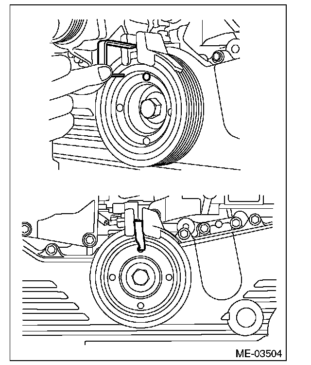 3) Slowly turn the crank pulley clockwise so that the service hole of the crank pulley comes around the top.
