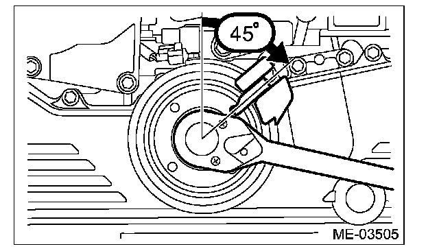 8) Slowly turn the crank pulley clockwise until the belt guide comes to approximately 45°.