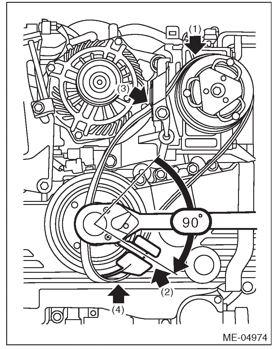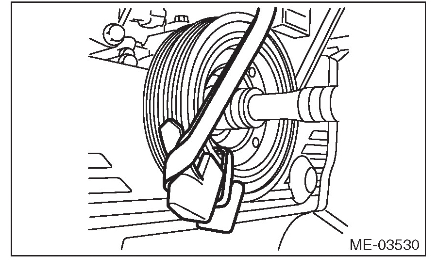 16) Make sure that the belt rib is securely installed on the groove of each pulley, then turn the crank pulley slowly, twice in the clockwise direction, to seat the rear side belt properly.