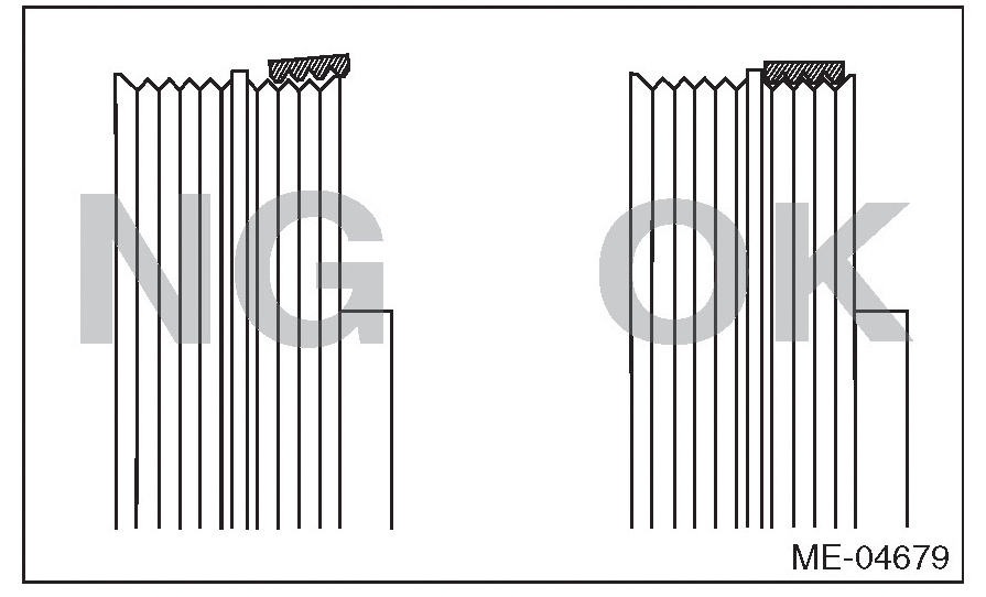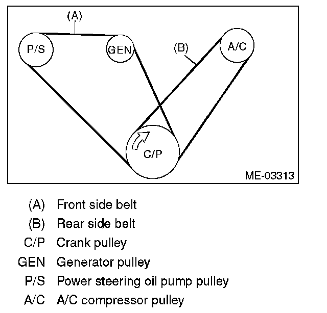 ^ If the front side belt tension is lower, the front side belt and crank pulley slip, causing abnormally high temperature on the crank pulley due to frictional heat. If this condition repeatedly occurs, the front side belt may abnormally wear, causing abnormal noise, front side belt damage or crank pulley damage.