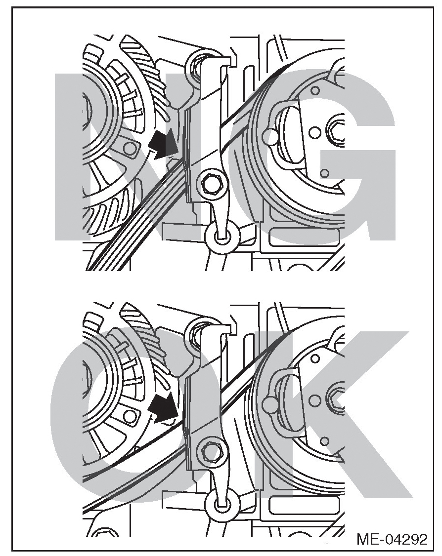 9) Place the rib surface of the rear side belt into the crank pulley groove, so that the rear side belt comes in between the belt guide holder.
