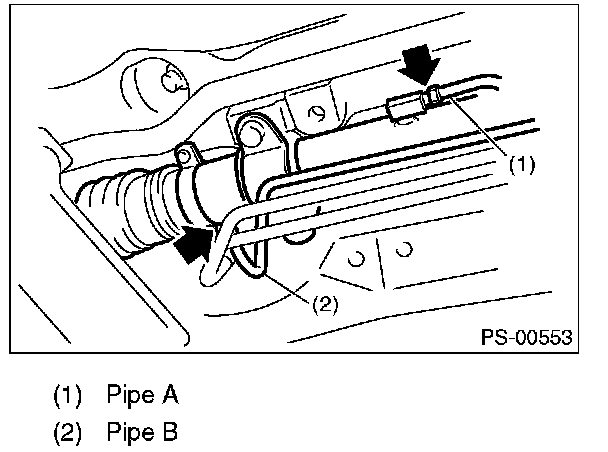 4) Remove the one pipe joint at the center of the gearbox, and connect the vinyl hose to the pipe and the joint. Discharge the fluid by turning the steering wheel fully clockwise and counterclockwise. Discharge the fluid similarly from other pipes.