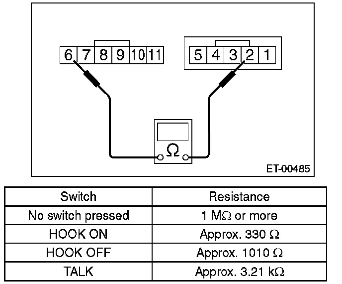 3. If internal resistance is out of specification shown in the above table, replace the steering switch.