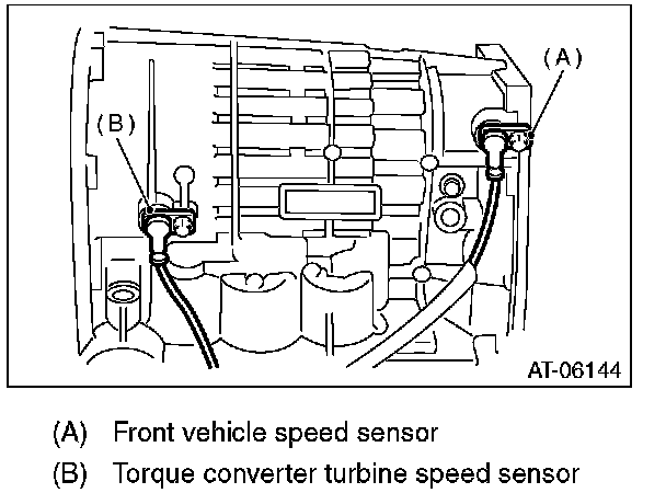 20) Remove the front vehicle speed sensor and torque converter turbine speed sensor.