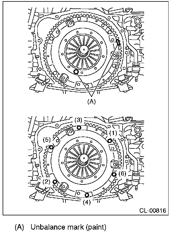 - When installing a clutch cover to the flywheel, position the clutch cover so that the spacing between the unbalance marks (paint mark) on the flywheel and clutch cover is 120° or more apart. (The unbalance mark indicates the direction of residual unbalance.)