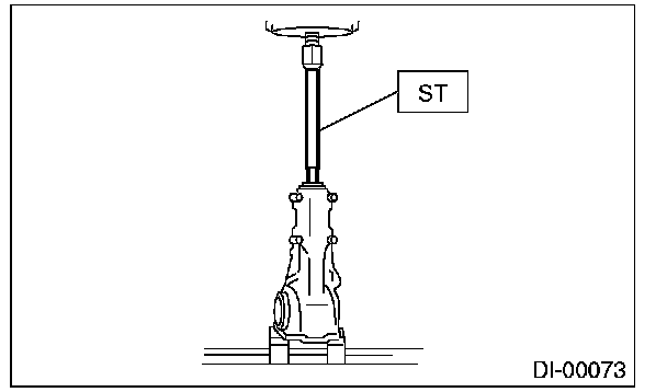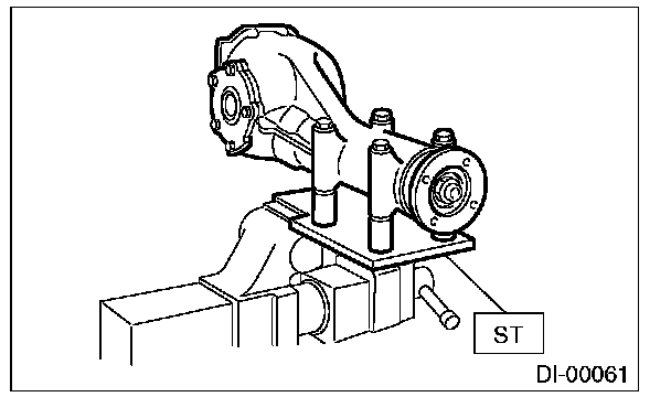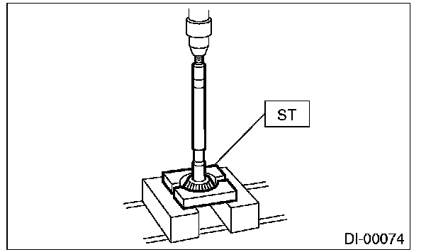 15) Press the end of drive pinion shaft by using the ST, and remove the drive pinion shaft, rear bearing cone, preload adjusting spacer and washer.