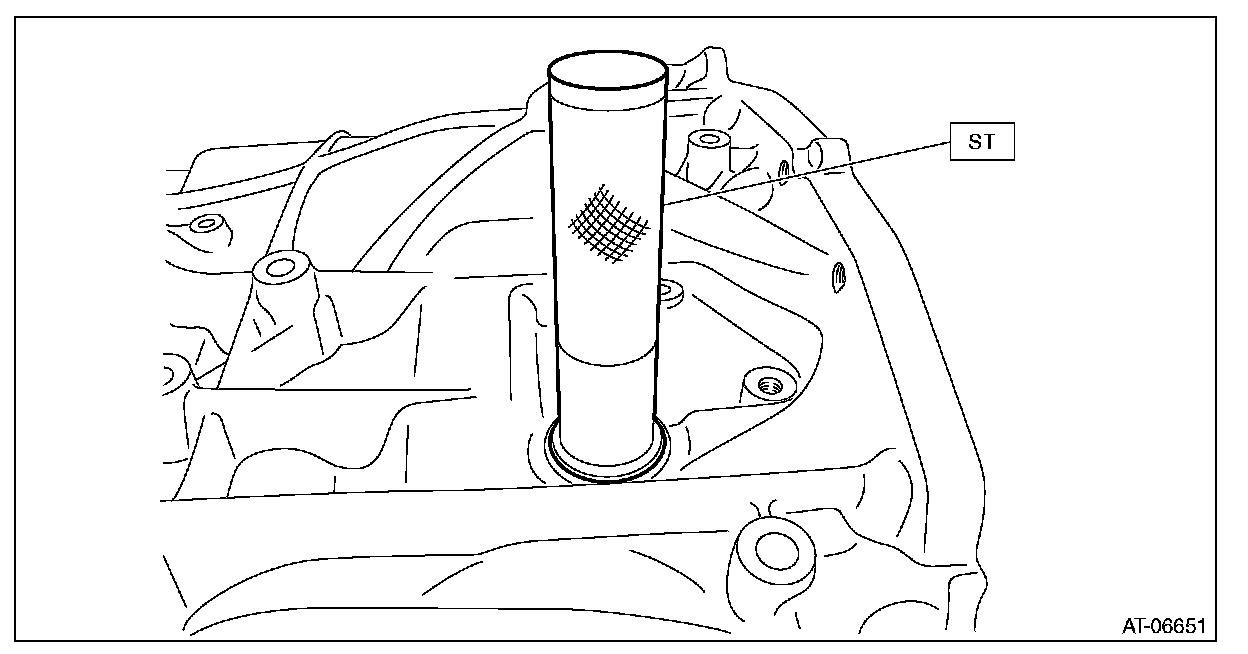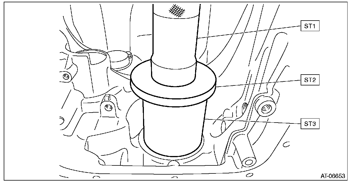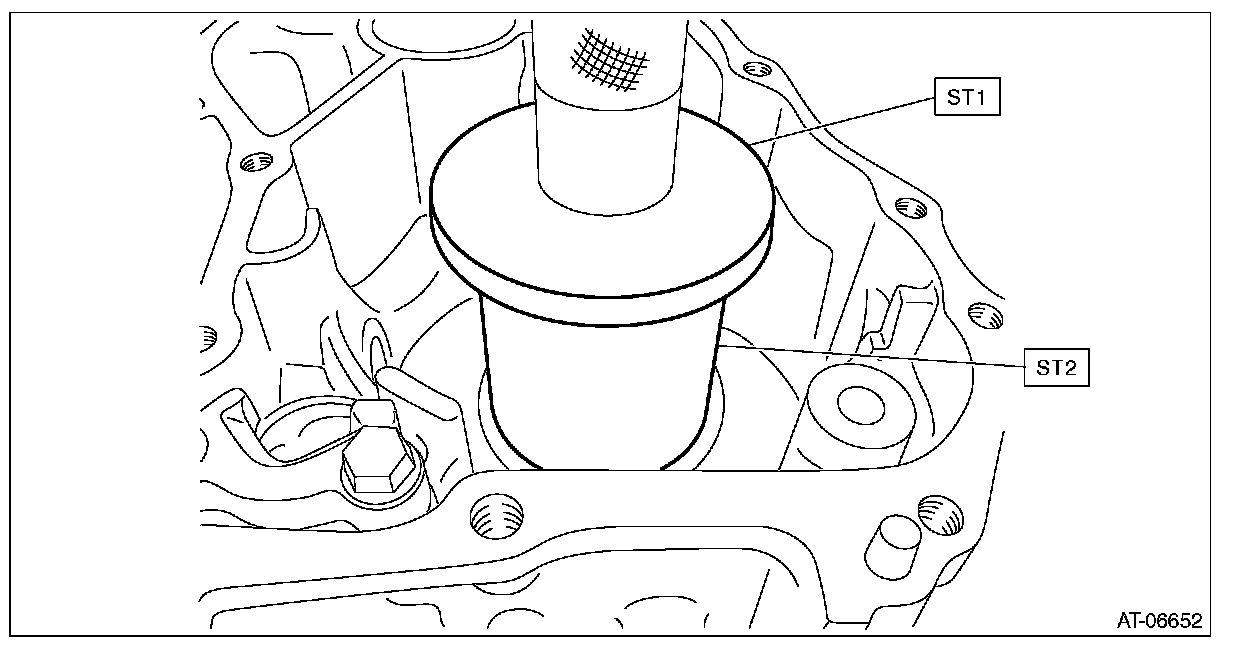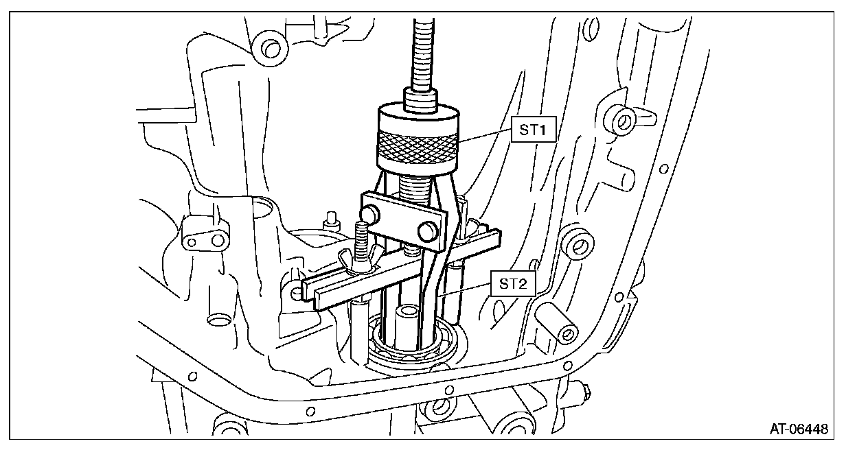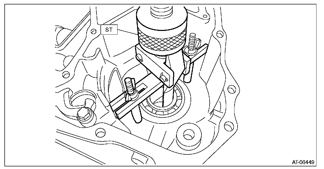 4) Using ST1 and ST2, install the ball bearing on the reduction driven gear side.