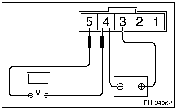 1. Connect the battery positive terminal to terminal No. 3 and the battery ground terminal to terminal No. 4, the circuit tester positive terminal to terminal No. 5 and the circuit tester ground terminal to terminal No. 4.
