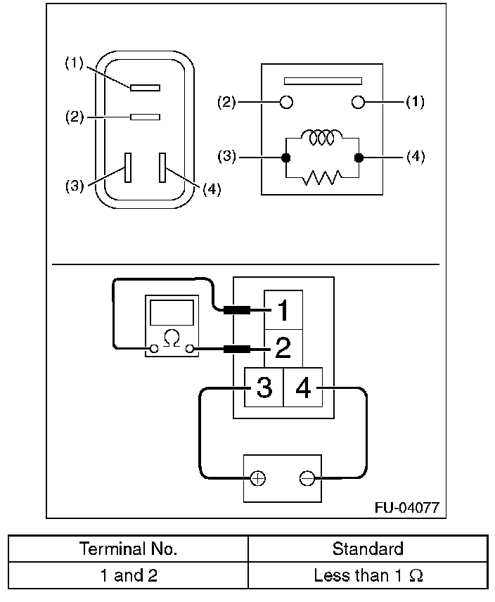 3. Connect battery positive terminal to terminal No. 3 and battery ground terminal to terminal No. 4, and measure the resistance between the electronic throttle control relay terminals.