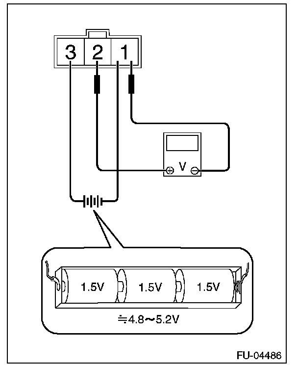 2. Connect dry-cell battery positive terminal to terminal No. 3 and dry-cell battery ground terminal to terminal No. 1, circuit tester positive terminal to terminal No. 2 and the circuit tester negative terminal to terminal No. 1.