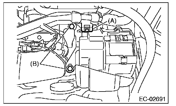 3. Disconnect the connector (A) and air duct (B) from secondary air pump and remove the secondary air pump.