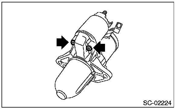 3. Remove screws (A) of the brush holder assembly, and through bolts (B) on both sides, and remove the starter cover assembly.