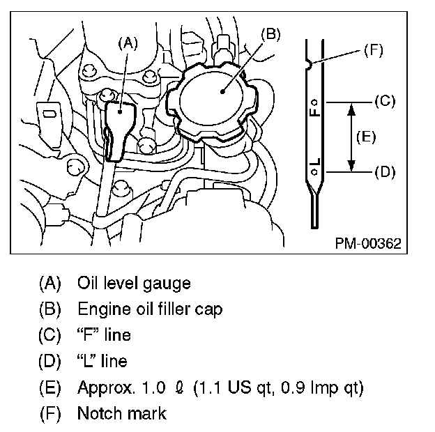 9) After stopping the engine, recheck the oil level. If necessary, add engine oil up to the "F" line on oil level gauge.