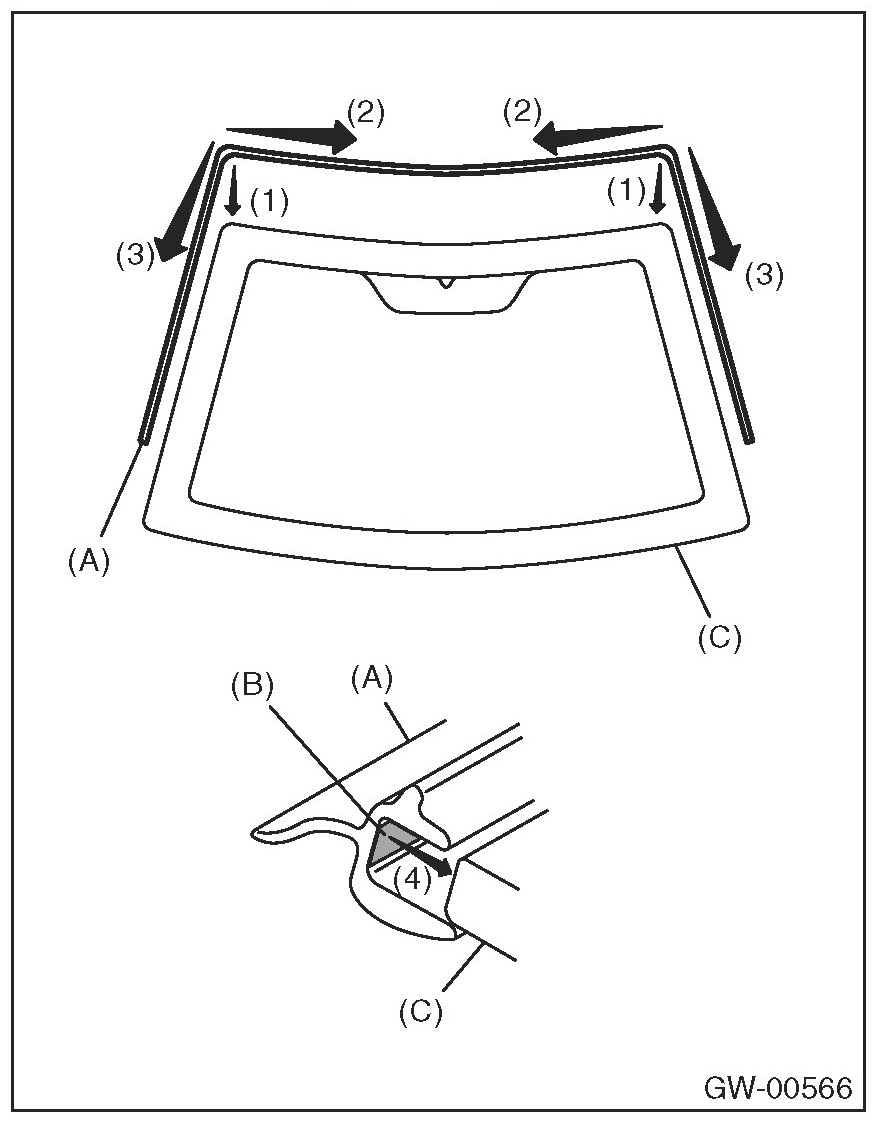 1. Align the molding (A) with both ends of the upper edge of the windshield glass (C).