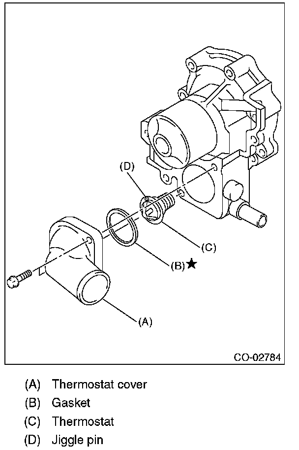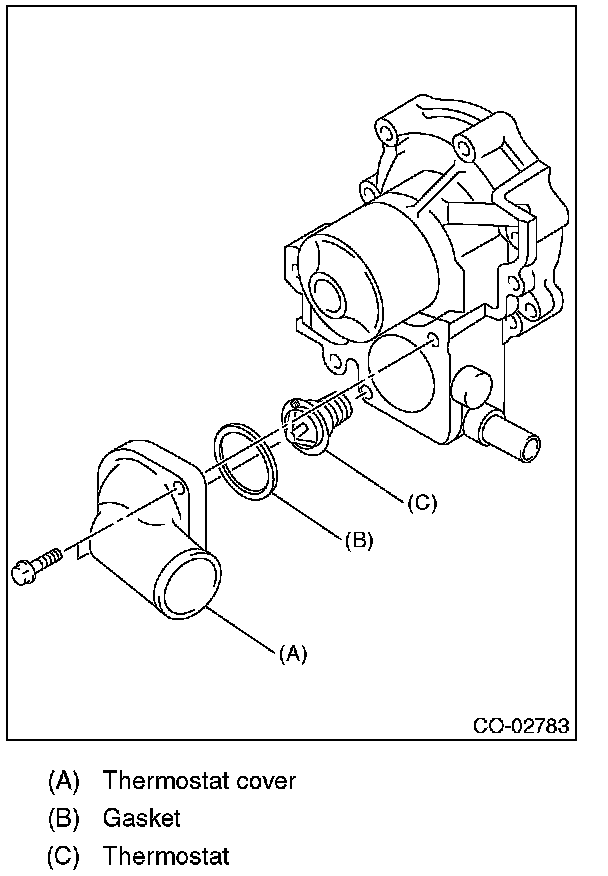 5) Remove the thermostat cover, and then remove the gasket and thermostat.