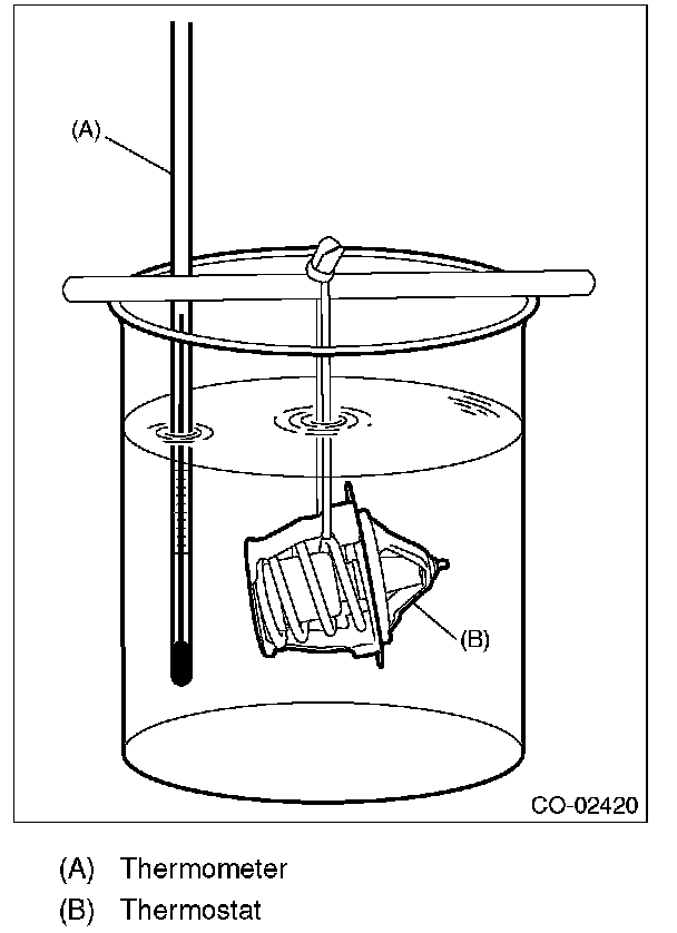 3) Immerse the thermostat and a thermometer in water. Raise water temperature gradually, and check the temperature and valve lift when the valve begins to open and when the valve is fully opened. Replace the thermostat if faulty.