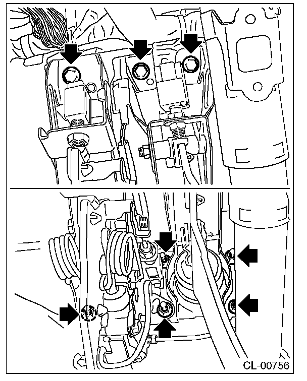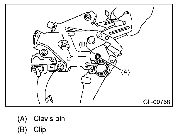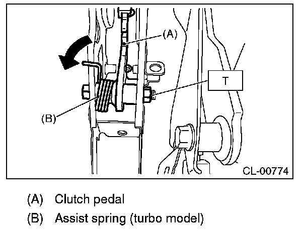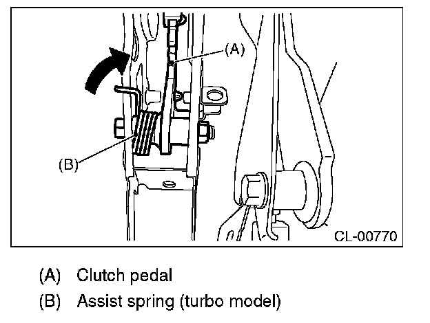 Before removing the clutch pedal mounting bolt, remove the hook of the assist spring from the pedal bracket. (turbo model)