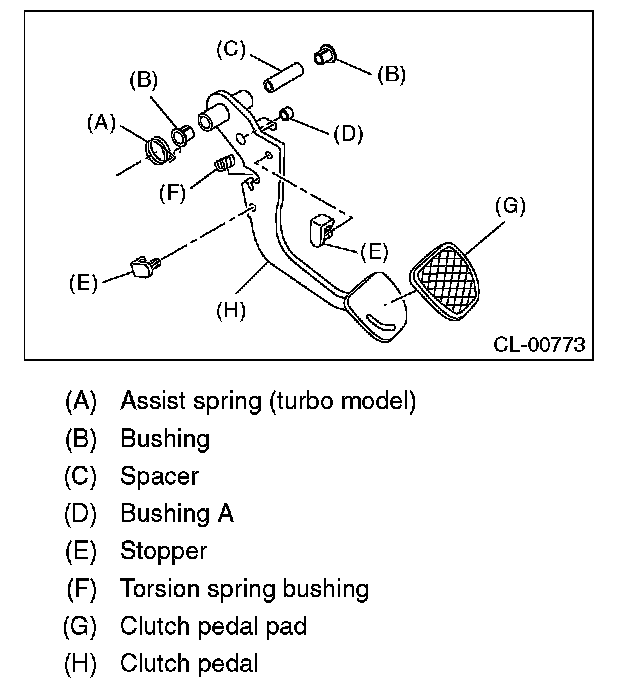 9) Remove the assist spring (turbo model), bushing, spacer, bushing A, stopper, torsion spring bushing and clutch pedal pad from the clutch pedal.