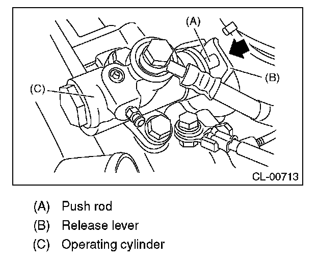 5) Push the release lever until the operating cylinder push rod retracts. Check that the clutch fluid level in the reservoir tank increases.