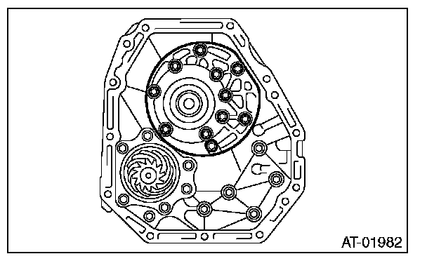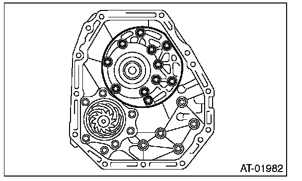 6) Remove the oil pump cover mounting bolt, and then separate the oil pump cover from the AT main case by lightly tapping with plastic hammer.