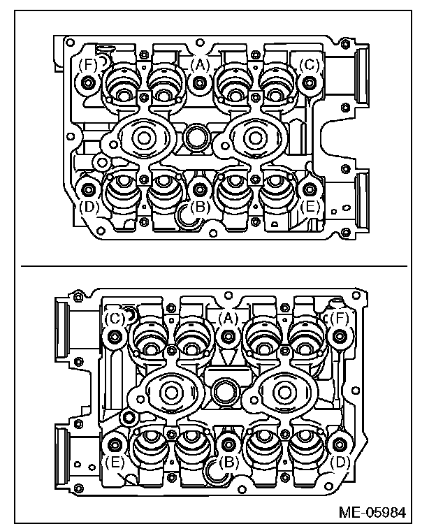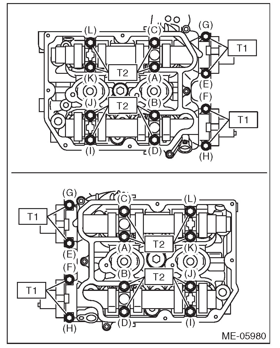 Gradually tighten the camshaft cap in at least two steps, in alphabetical order shown in the figure, and then tighten to the specified torque.