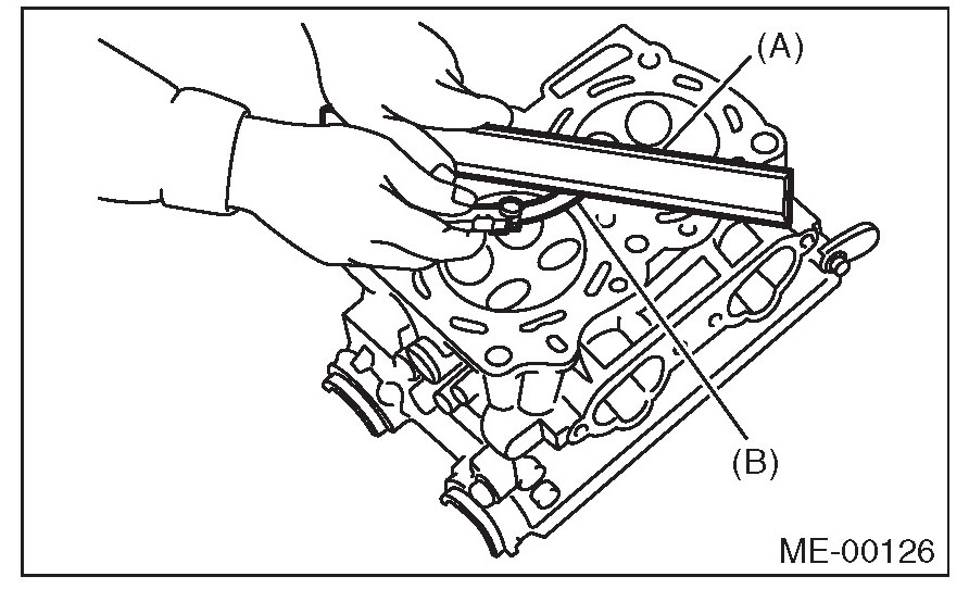 Measure the warping of the cylinder head surface that mates with cylinder block using a straight edge (A) and thickness gauge (B).