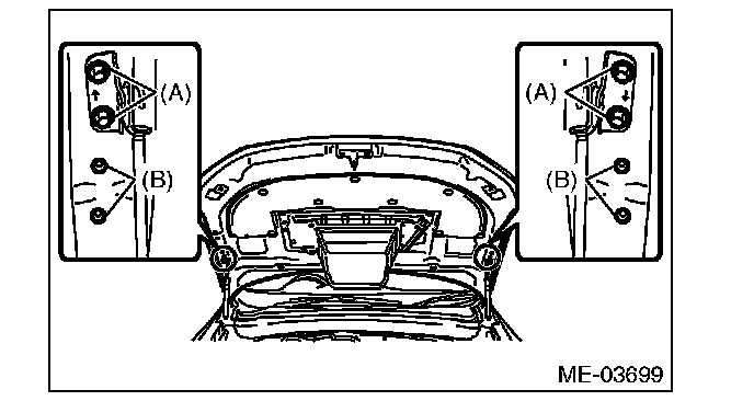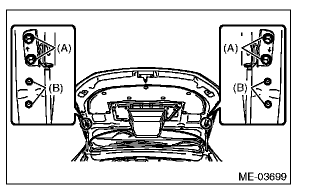 31) Change the bolt installation position from (B) to (A), then close the front hood.