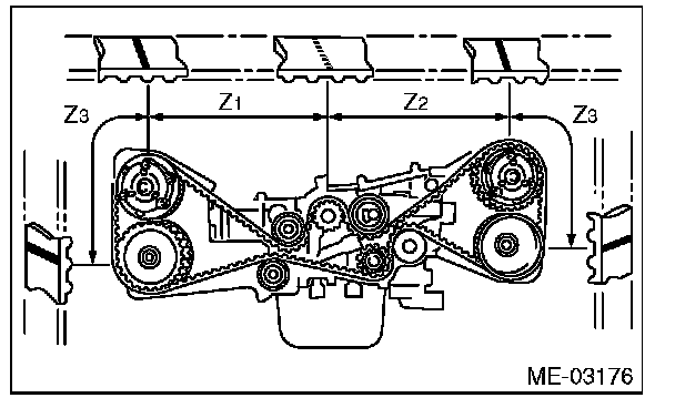 8) Align the alignment mark on the timing belt with marks on the sprockets in the alphabetical order shown in the figure. While aligning marks, position the timing belt properly, and install the timing belt.
