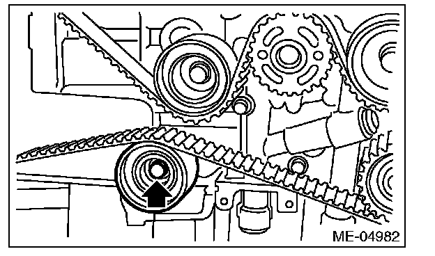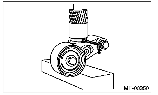 2) Check the belt tension pulley for smooth rotation. Replace the automatic belt tension adjuster assembly with a new part if abnormal noise or excessive play occurs.