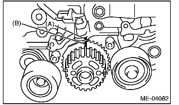 3) Align the single line mark (B) on the exhaust cam sprocket RH with notch (A) on the timing belt cover.