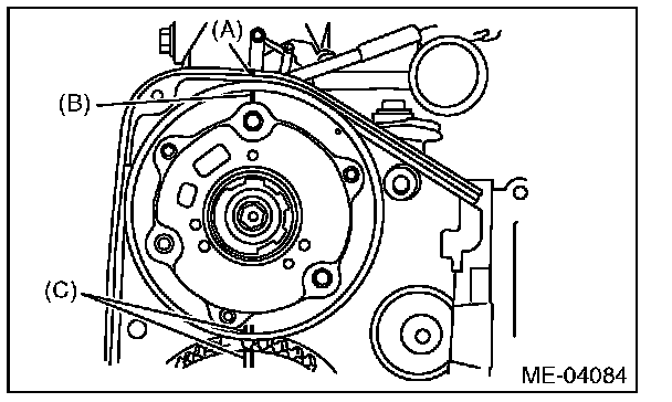 6) Align the single line mark (B) on intake cam sprocket LH with notch (A) on the timing belt cover by turning the sprocket clockwise (as viewed from front of engine). Make sure that the double line marks (C) on intake cam sprocket and exhaust cam sprocket are aligned.