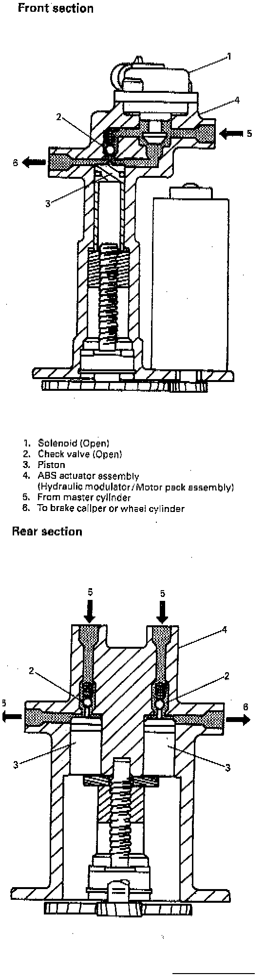 Two paths are available to transfer brake fluid to the calipers: (1) through the modulator, around the open check valve and out to the caliper, and (2) through the modulator, through the normally open solenoid and out to the caliper. The solenoid in the front circuits provides an alternate brake fluid pressure path to the caliper. With this arrangement, if the ABS were to lose power or malfunction with the piston out of the "home" position, a redundant brake fluid path is available. The rear channel operates in a similar manner except no solenoid is used.