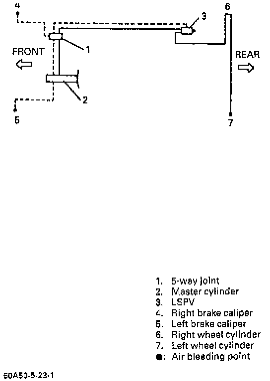 Hydraulic lines of brake system consists of two separate lines, one for front wheel brakes and the other for rearwheel brakes. Air bleeding is necessary at right and left front wheel brakes, left rear wheel brake and LSPV, i.e. 4 places in all.