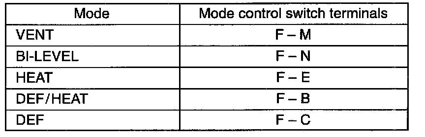 - Check if continuity exists between each pair of terminals listed when mode control button is pressed.