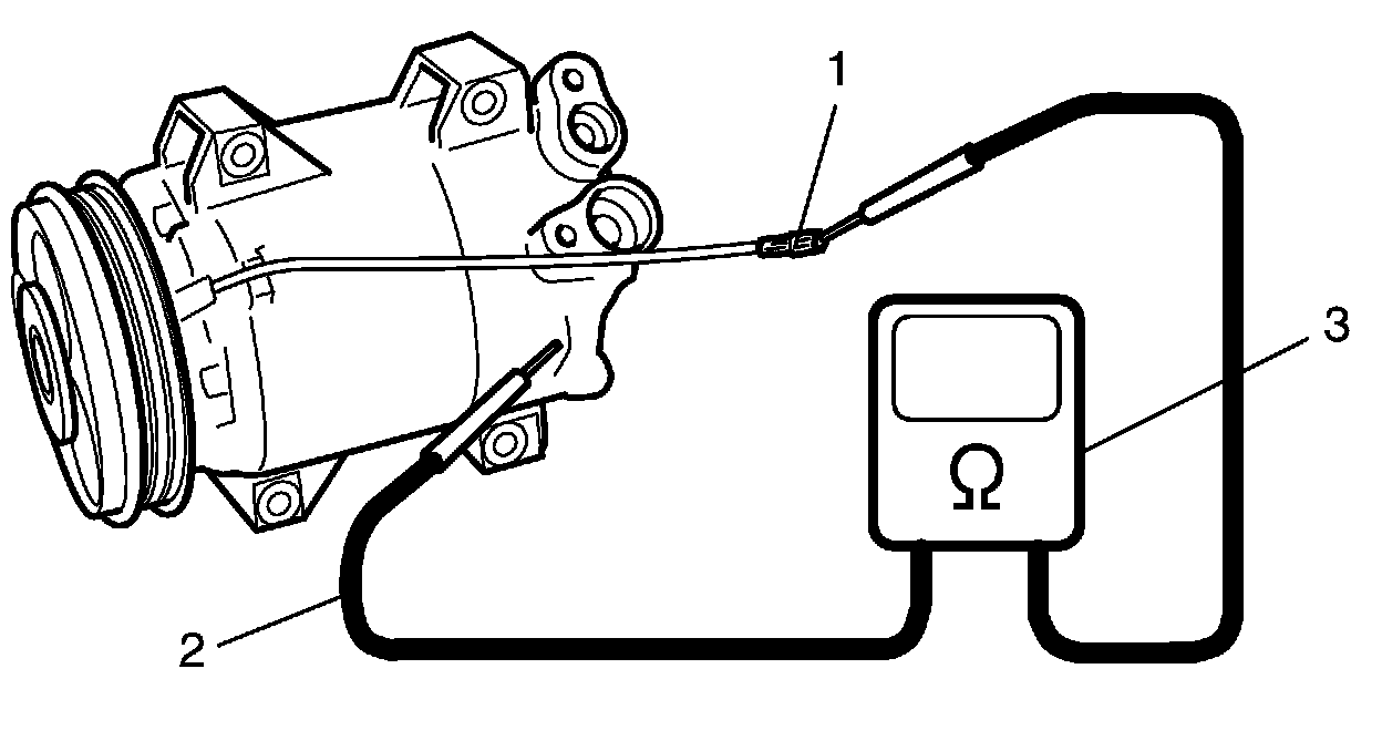 - Using an ohmmeter (3), measure resistance of stator coil between clutch lead wire (1) and body ground (2).