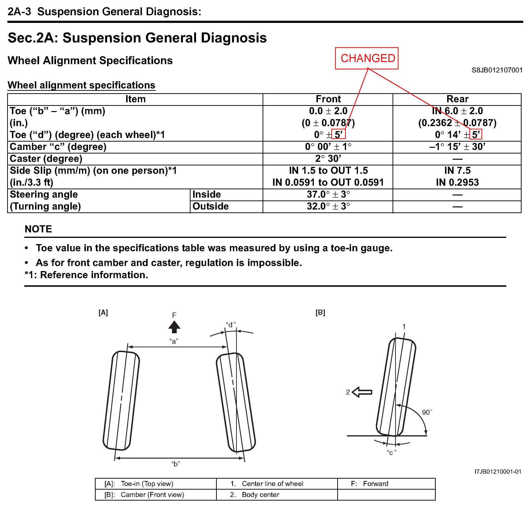 Front and rear wheel alignment toe tolerance specification for each wheel has been changed.