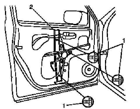 3. Remove regulator mounting screws (1), and then remove front door window regulator (2).