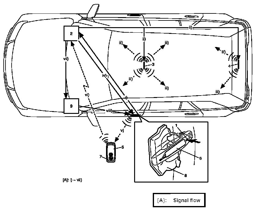 The keyless start control module compares the ID code sent from the remote controller with the ID code registered in the keyless start control module. If both ID codes match, the keyless start control module outputs the lock or unlock request signal (depending on the door lock switch (8) state then) to BCM (9). When BCM receives such signal through CAN communication from the keyless start control module, it activates the door lock actuator to lock or unlock doors.