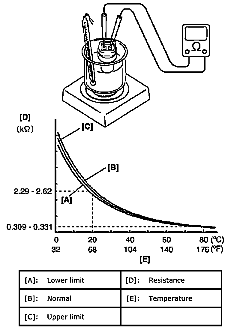 Immerse temperature sensing part of ECT sensor in water and measure resistance between sensor terminals while heating water gradually. If measured resistance doesn't show characteristics as shown in the figure, replace ECT sensor.