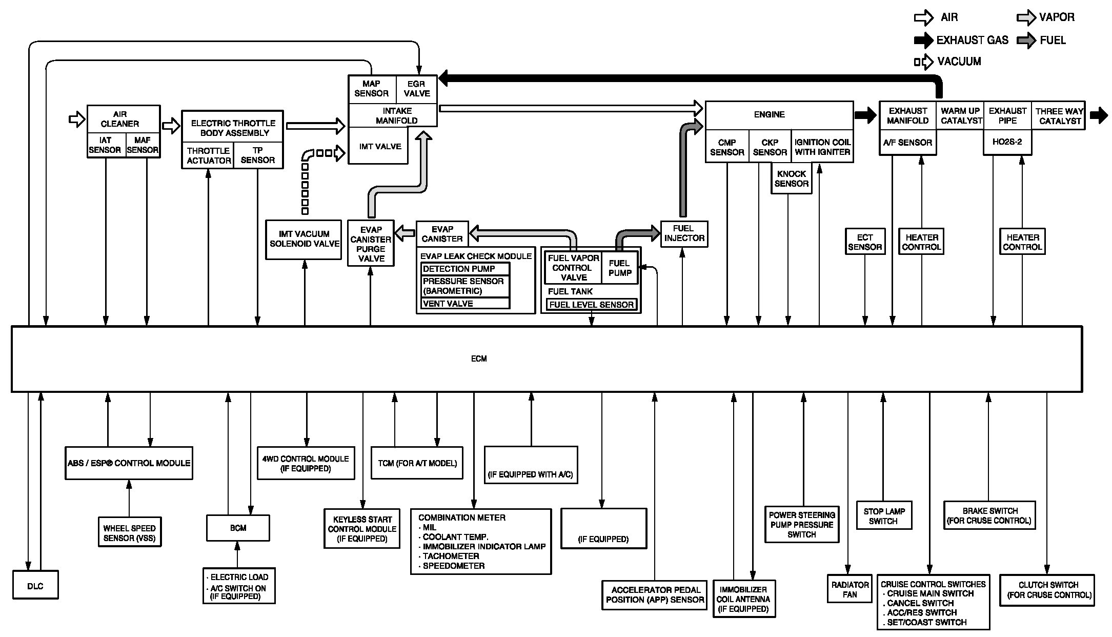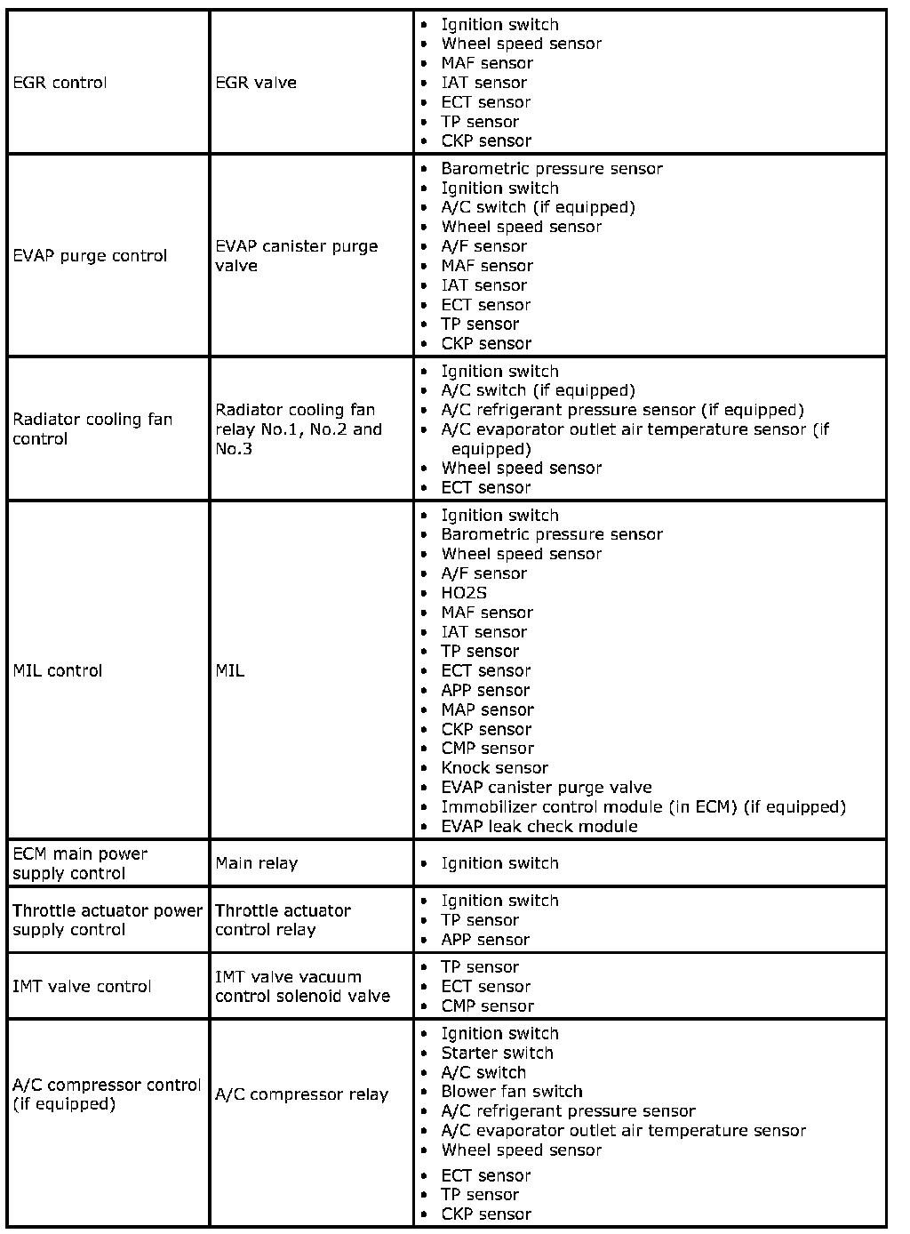 Electronic Control System DescriptionThe electronic control system consists of various sensors which detect the state of engine and driving conditions, ECM which controls various devices according to the signals from the sensors and various controlled devices. Functionally, it is divided into the following sub systems: