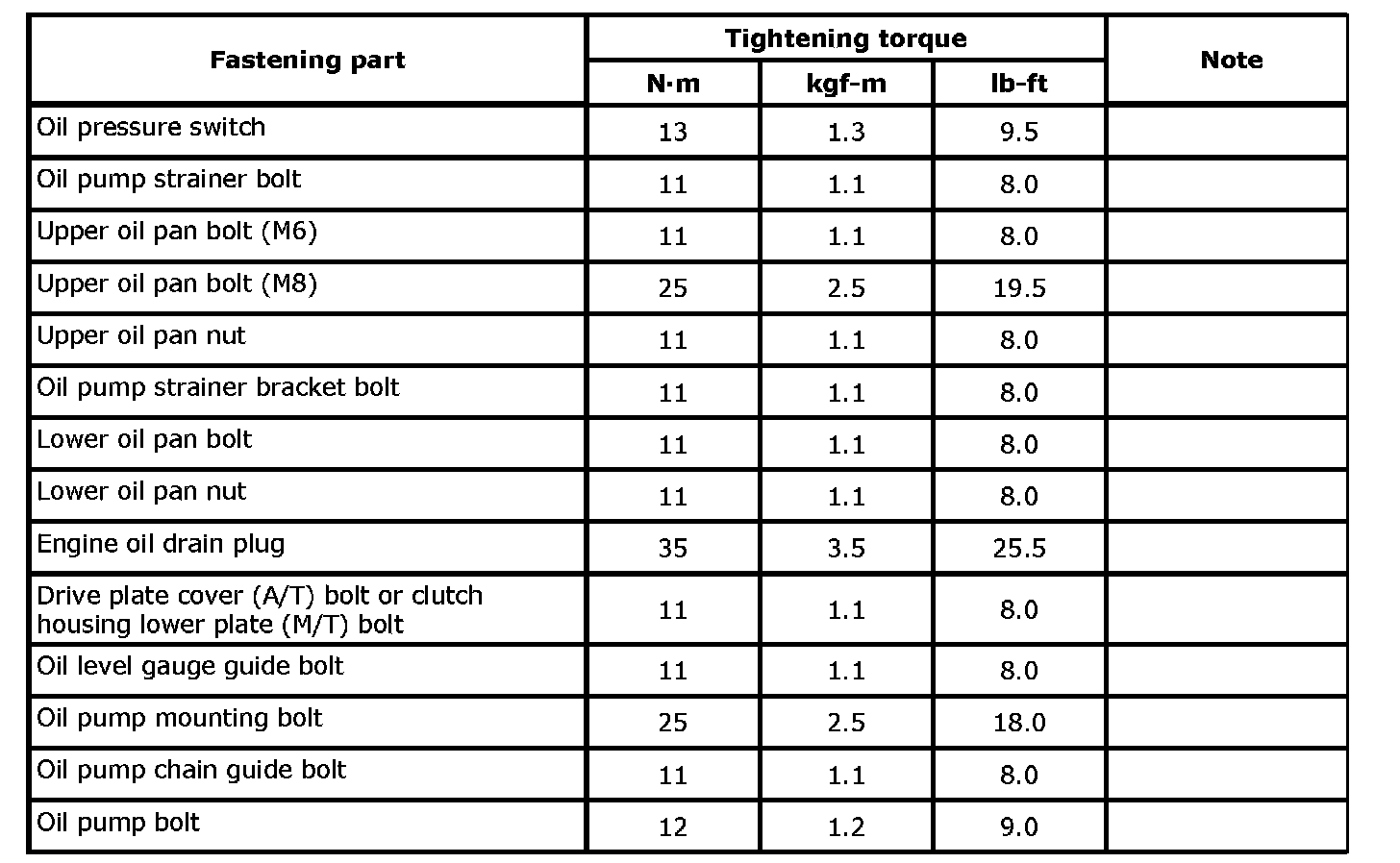 Tightening Torque Specifications