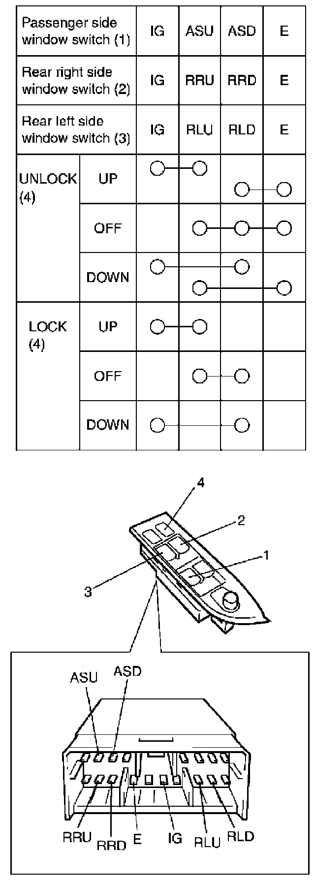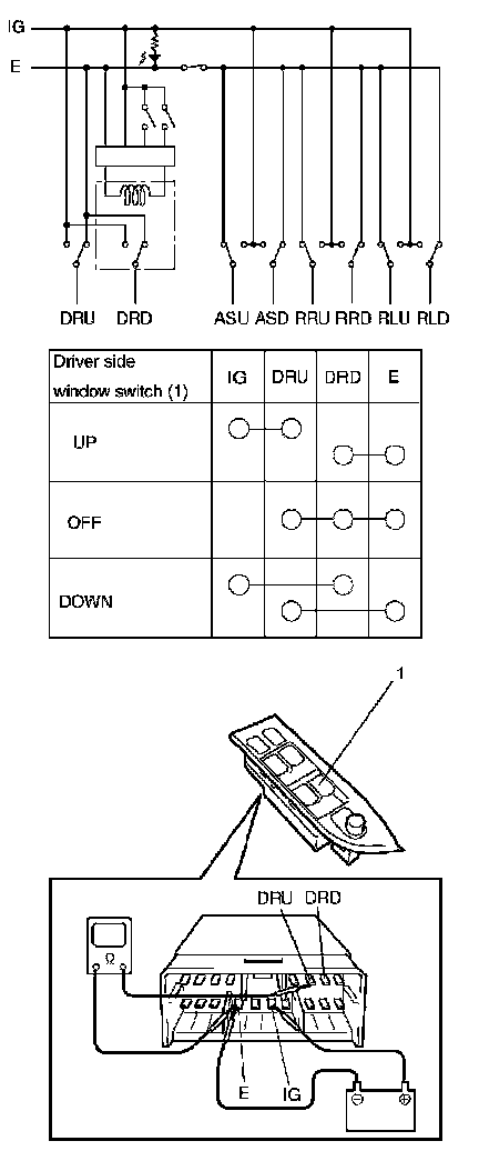 3. Connect 12 V battery positive (+) terminal to terminal "IG" of power window main switch and its negative (-) terminal to terminal "E" of power window main switch.