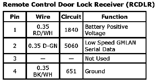 Remote Control Door Lock Receiver (RCDLR)Connector Part Information