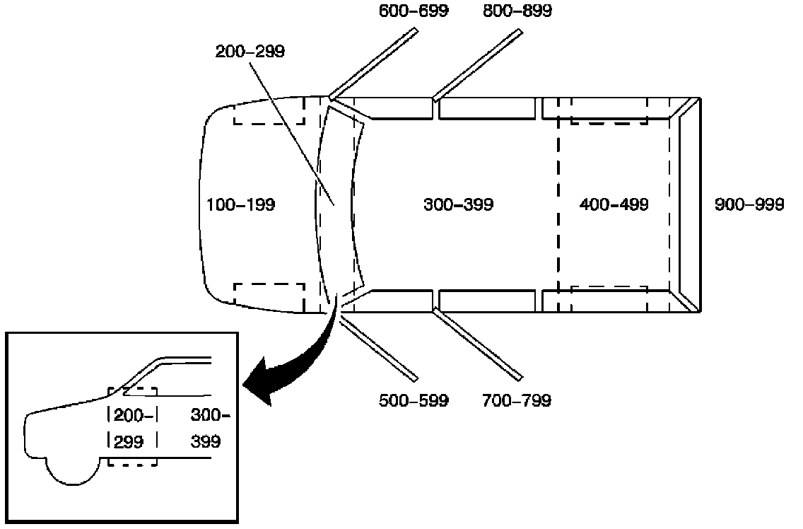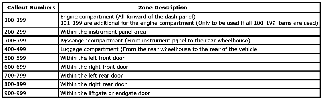 All grounds, in-line connectors, pass-through grommets, and splices have identifying numbers that correspond to where they are located in the vehicle. The following table explains the numbering system.