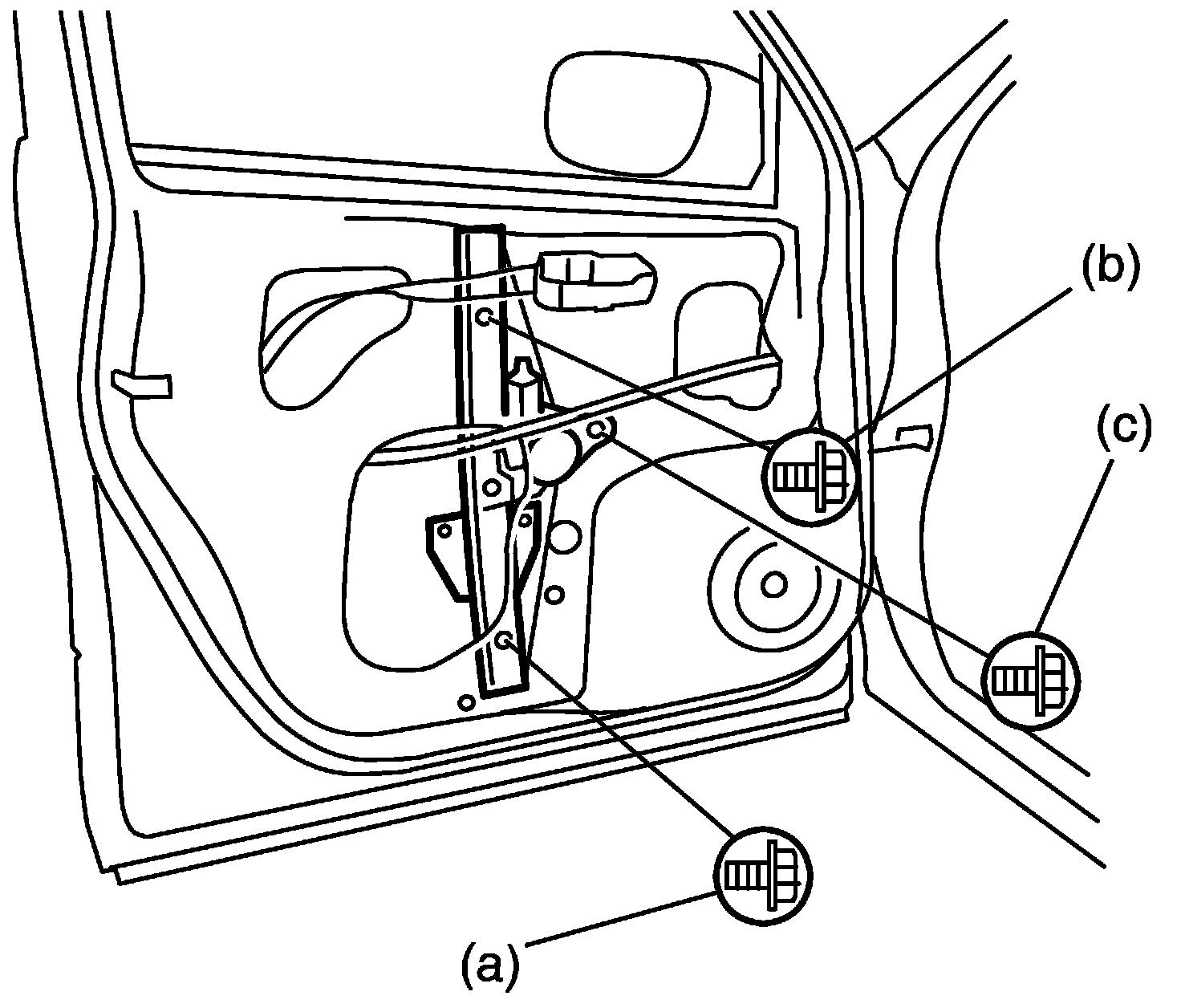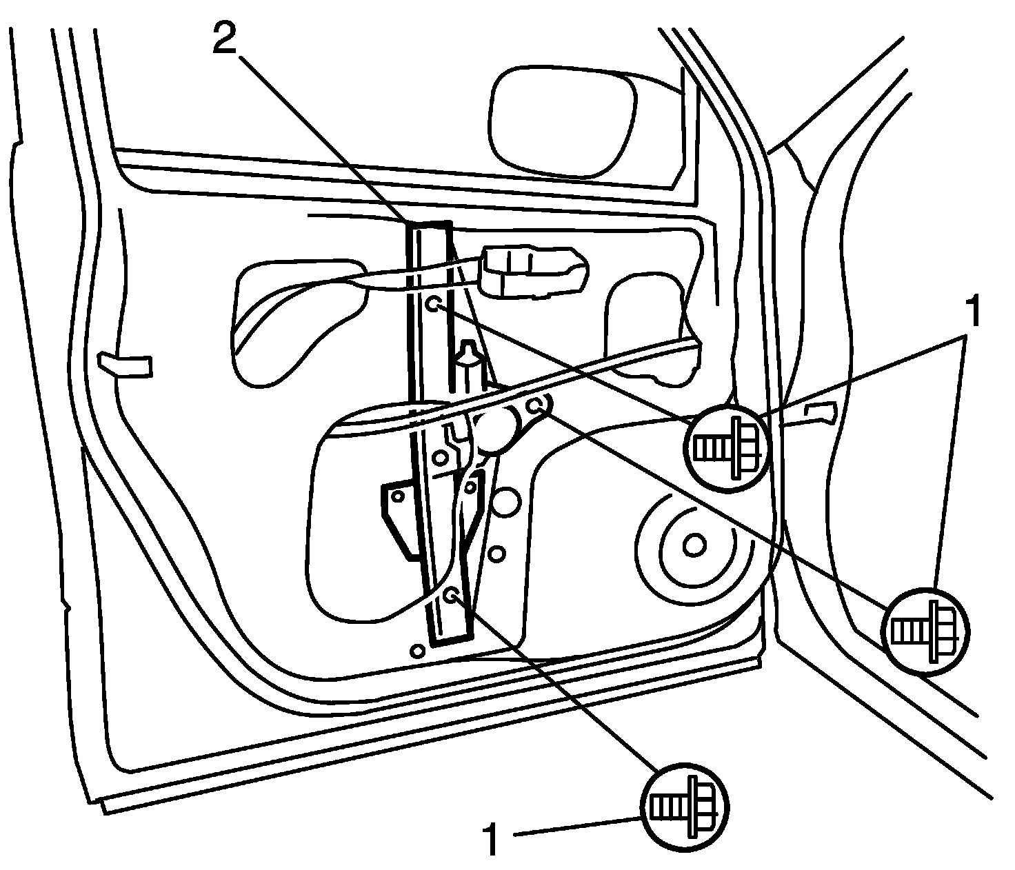 3. Remove regulator mounting screws (1), and then remove front door window regulator (2).