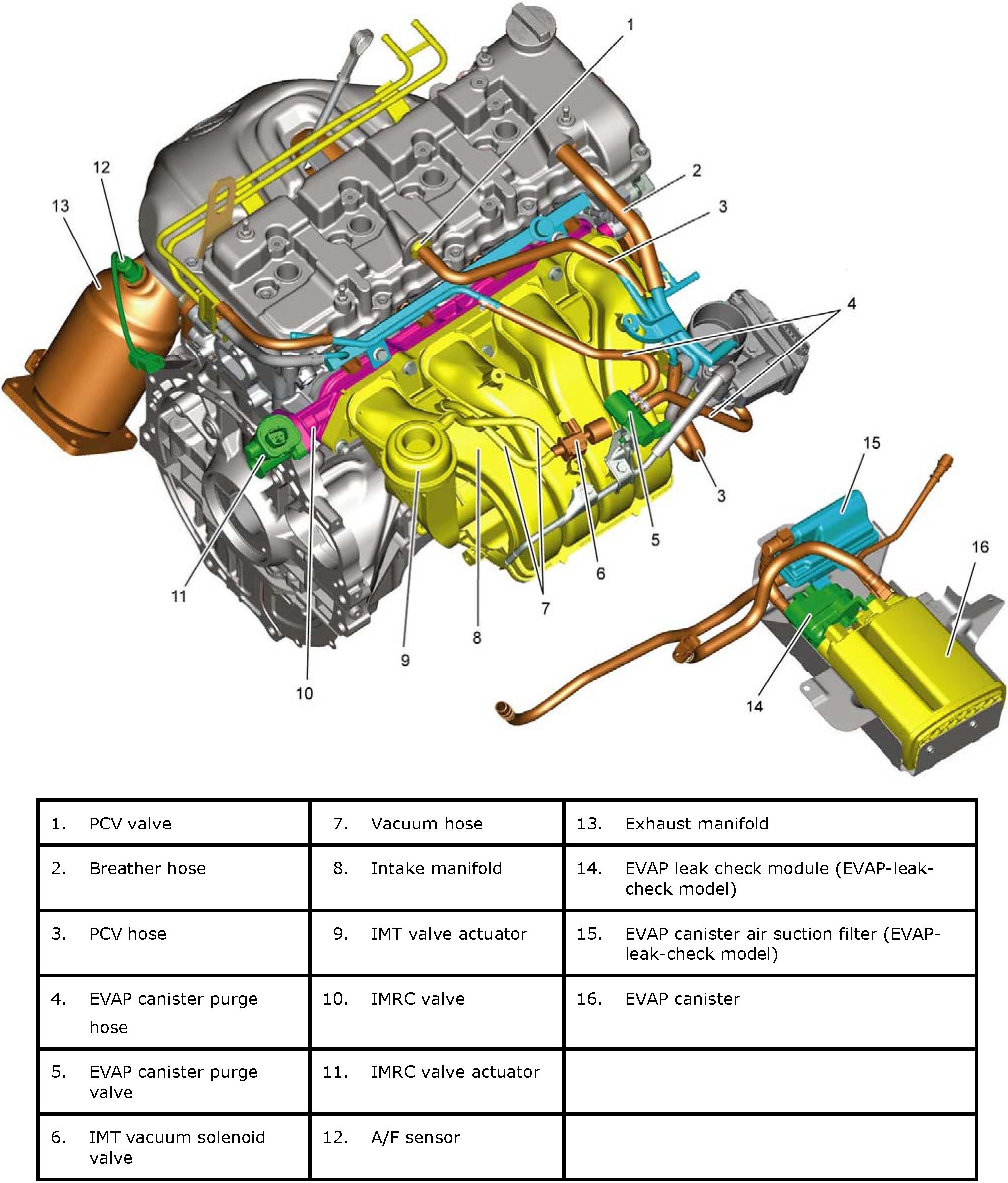 The air intake system includes air cleaner, mass air flow sensor, throttle body, IMT (Intake Manifold turning) valve, intake manifold and IMRC (Intake Manifold Runner control) valve. The fuel delivery system includes fuel pump, delivery pipe, fuel pressure regulator, fuel injectors, etc.